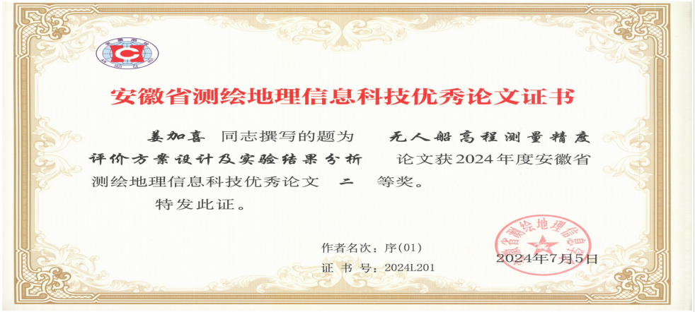 集團所屬設計總院姜加喜、舒江洲同志撰寫的論文《無人船高程測量精度評價方案設計及實驗結果分析》獲2024年度安徽省測繪地理信息學會測繪地理信息科技優(yōu)秀論文二等獎。
