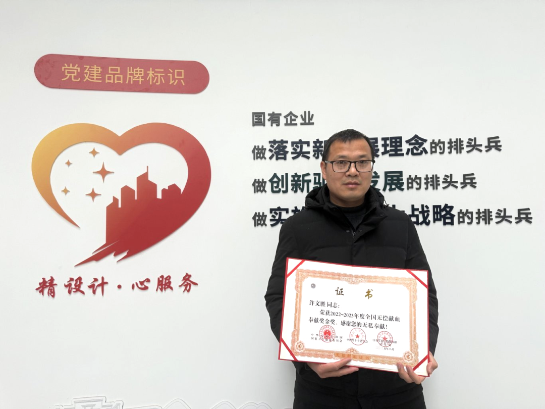 近日,集團(tuán)所屬設(shè)計總院員工許文勝同志榮獲由國家衛(wèi)生健康委員會、中國紅十字會總會、中央軍委后勤保障部衛(wèi)生局頒發(fā)的“2022—2023年度全國無償獻(xiàn)血獎金獎”,以表彰他二十年如一日的無償奉獻(xiàn)。