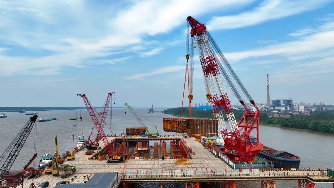 9月4日18時(shí),在距離池州岸約400米的長江江面施工現(xiàn)場,隨著一艘1000噸級(jí)吊船平穩(wěn)地將底節(jié)最后一吊鋼圍堰準(zhǔn)確下放到位,標(biāo)志著中鐵大橋局承建的集團(tuán)“頭號(hào)工程”池州長江公鐵大橋南主塔墩(4號(hào)墩)大橋南主墩建設(shè)率先轉(zhuǎn)入圍堰施工階段。