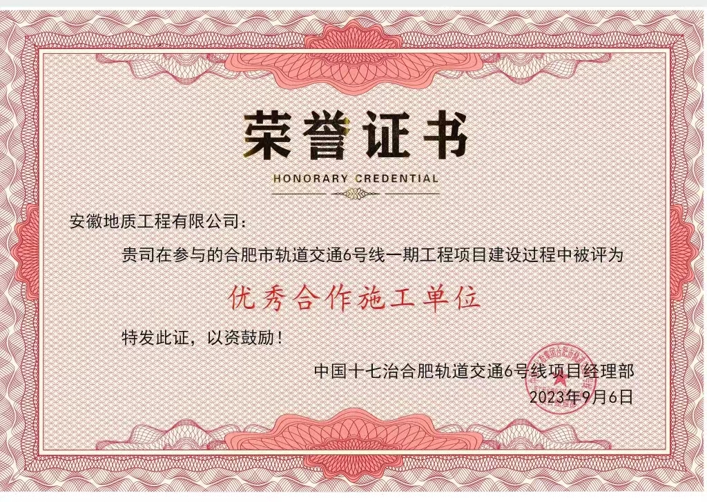 近日,建投集團所屬安徽地質(zhì)工程有限公司喜獲中國十七冶合肥軌道交通6號線項目經(jīng)理部頒發(fā)的“優(yōu)秀合作施工單位”榮譽稱號,這是對地質(zhì)工程公司在該項目施工過程中的突出表現(xiàn)的肯定。