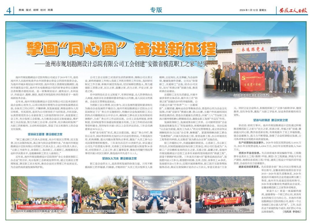 近日,安徽省總工會發(fā)布《關(guān)于命名安徽省模范職工之家、安徽省模范職工小家和安徽省優(yōu)秀工會工作者的決定》,集團(tuán)下屬設(shè)計(jì)總院榜上有名,榮獲“安徽省模范職工之家”榮譽(yù)稱號。今日,《安徽工人日報(bào)》對設(shè)計(jì)總院職工之家創(chuàng)建進(jìn)行了報(bào)道以下為報(bào)道全文