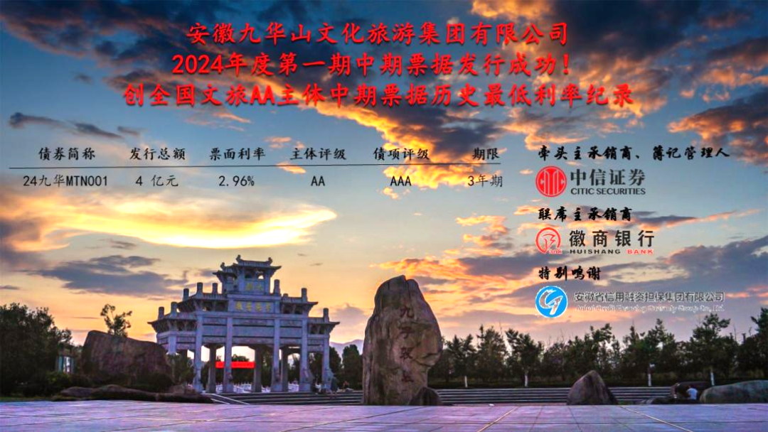 2024年1月26日,文旅集團(tuán)2024年度第一期中期票據(jù)(24九華MTN001)成功發(fā)行。募集資金規(guī)模4億元,期限3年,票面利率2.96%,認(rèn)購倍數(shù)4.9倍,創(chuàng)全國文旅AA主體中期票據(jù)歷史最低利率記錄!