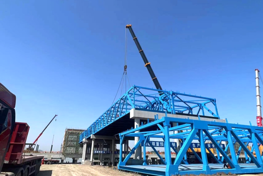 3月22日,烏沙港跨堤段鋼引橋安全平穩(wěn)吊裝至指定位置,安裝精度符合設(shè)計(jì)要求,經(jīng)過近二十個(gè)小時(shí)的奮戰(zhàn),跨堤段鋼引橋吊裝成功,為水域部分與陸域部分搭建了“橋梁”。