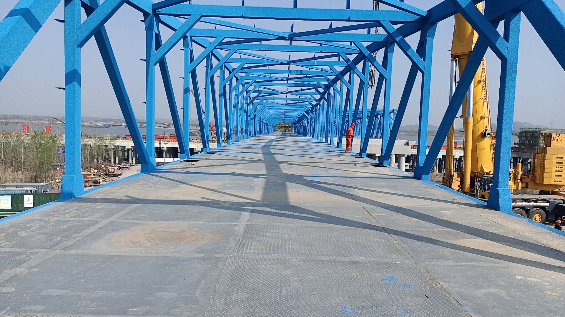 此次吊裝的兩座鋼引橋長度均為54.6米,8米寬型重108噸,12米寬型重163噸,屬超危大工程,且引橋橫跨長江大堤,坡頂?shù)狡履_的坡度小,存在“場地小、機(jī)械多、人員多、工序多”的情況,進(jìn)一步增加了安全風(fēng)險(xiǎn)和施工難度。