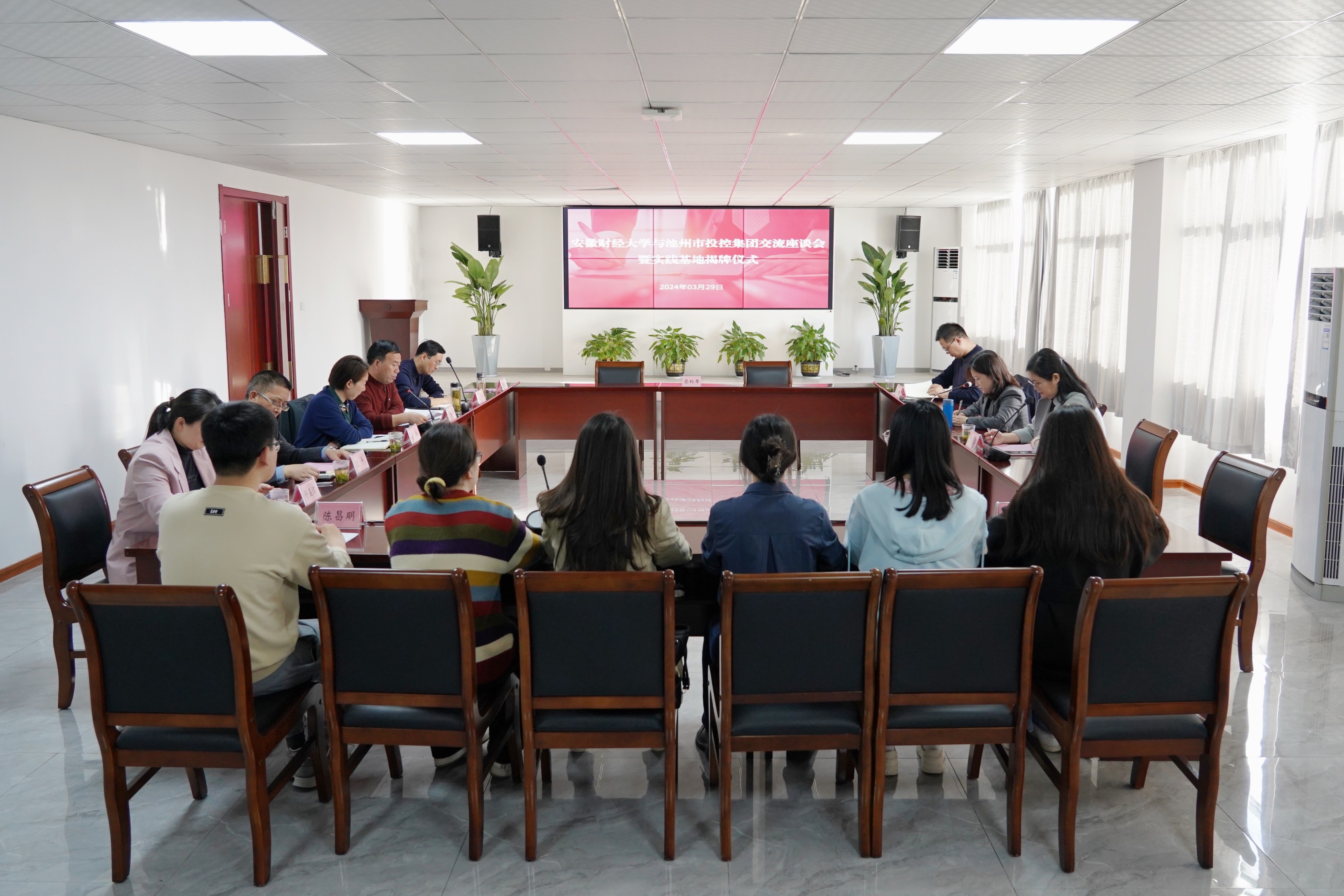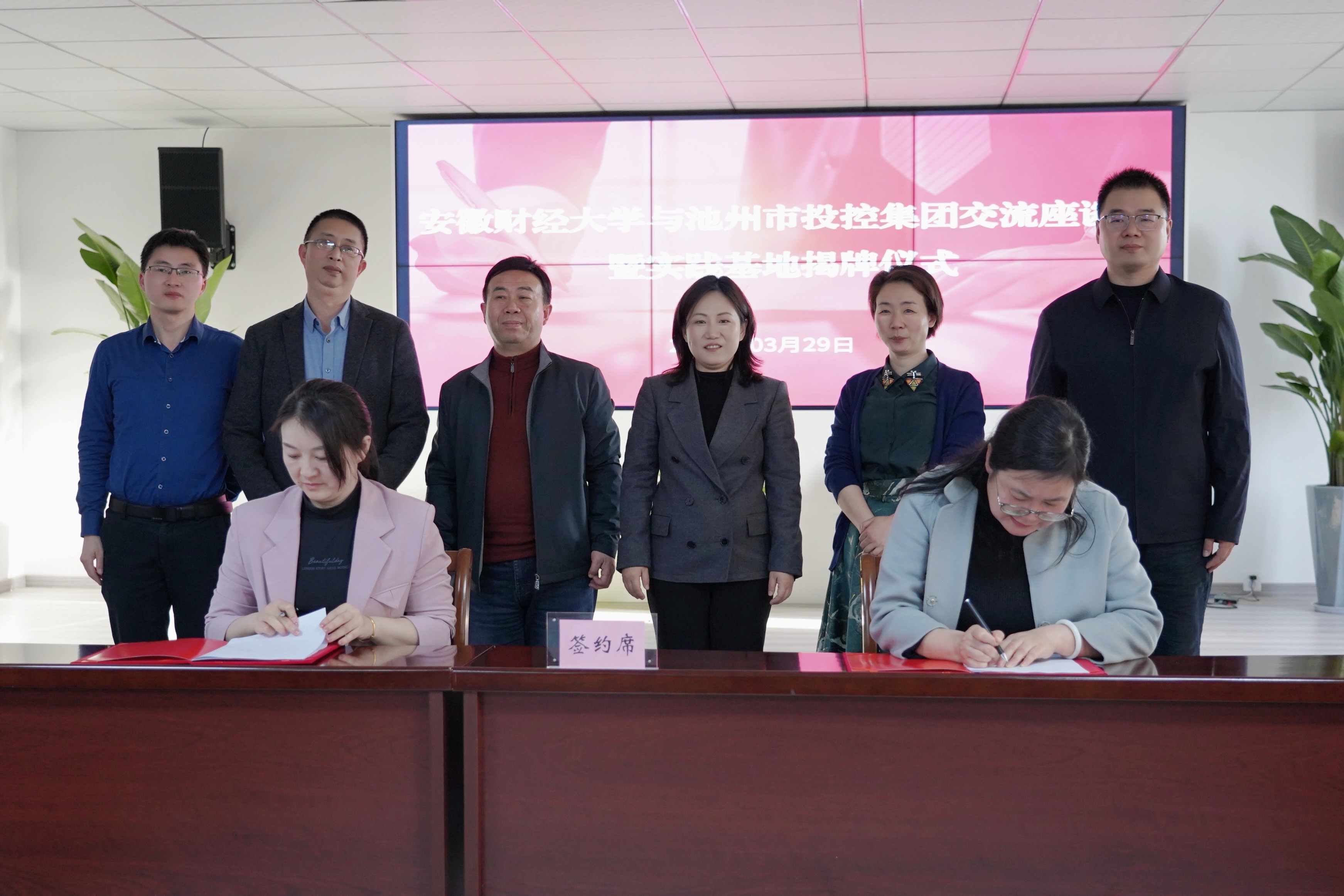 3月29日下午,安徽財經(jīng)大學與池州市投資控股集團舉行“就業(yè)創(chuàng)業(yè)實踐基地”簽約暨揭牌儀式。安財校黨委常委、副校長趙曉明,校學生處副處長丁龍華,校團委副書記袁寶剛,校團委兼職副書記董松濤,池州市人社局黨組成員、市人事考試指導中心主任章和平,市就業(yè)創(chuàng)業(yè)服務中心主任紀平,就業(yè)促進科科長孟華等有關(guān)領導參加活動。儀式由黨委副書記、工會主席嚴艷主持。